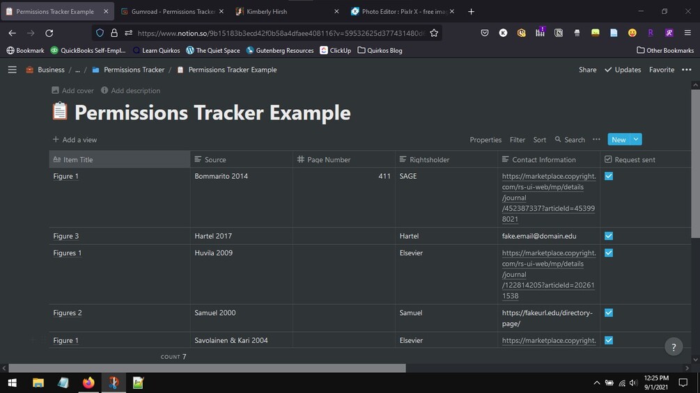 You'll get a Notion template with columns for tracking details about copyrighted material you need to reuse and a filled in example of how to use the template.